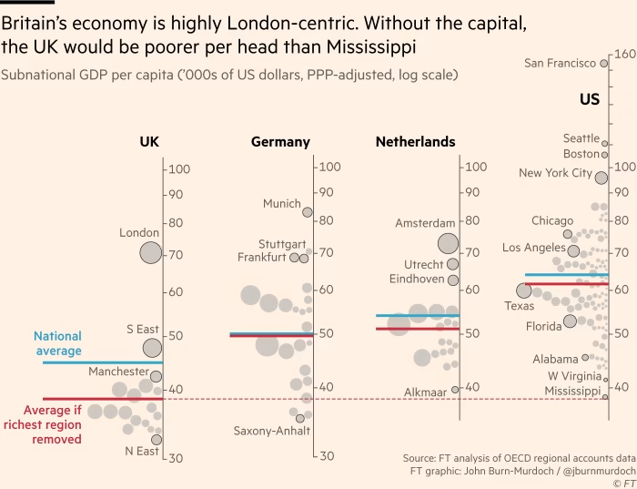 “Removing London’s output and headcount would shave 14 per cent off British living standards, precisely enough to slip behind the last of the US states […] By comparison, amputating Amsterdam from the Netherlands would shave off 5 per cent, and removing Germany’s most productive city (Munich) would only shave off 1 per cent […] if the whole of the bay area from the Golden Gate to Cupertino seceded tomorrow, US GDP per capita would only dip by 4 per cent.”